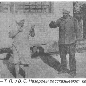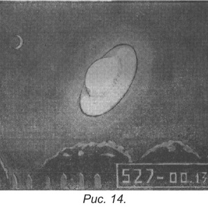 В ночь с субботы 26 мая на воскресенье 27 мая 1990 года пенсионеры Татьяна Петровна и Василий Сидорович Назаровы готовились отойти ко сну. Хозяин дома уже лег и дремал, а хозяйка решила выйти во двор. Было уже минут пятнадцать первого ночи. Опрос показал, что именно в это время у сельского клуба недалеко от дома Назаровых находилась группа местной молодежи, праздновавшая увольнение из армии в запас одного из своих сверстников. Возле клуба они выпустили вверх красную ракету. Поднявшись на высоту примерно метров 70-80, огонь ракеты раздвоился. Одна часть горевшего вещества, затухая, стала возвращаться к земле по направлению к дому Назаровых. Это позже послужило поводом говорить в селе, что Назаровы видели не НЛО, а вот эту часть красной ракеты. Но дело обстояло иначе. В это время Татьяна Петровна толкнула дверь из прихожей в сени — небольшую пристройку к дому, и ахнула. Сначала ей показалось, что начался пожар и уже горят сараи у дома. Весь небольшой двор был покрыт ярким красным светом. Он пульсировал, дрожал, создавал образ именно бушующего пламени. В глаза ей бросились три луча. Татьяна Петровна так и не поняла, откуда они идут. Лучи шли, ей показалось, прямо от сеней, где она находилась, в поселок, бросая часть красного света ей во двор. Неведомый «прожектор» послал три луча продолжительностью несколько секунд каждый примерно с секундной паузой между ними. С каждым разом направление луча несколько смещалось вправо. Затем послышались странные звуки, которые Т. П. Назарова назвала «щелкотней». Они были очень громкими («щелк-щелк-щелк», говорила Татьяна Петровна) и раздавались прямо над головой. Сразу после «щелкотни» послышался пронзительный визг, напомнивший ей звуки, которые могла бы издавать пилорама или работающий на очень больших оборотах электродвигатель. Позже Татьяна Петровна говорила, что эта «щелкотня» и «визг» продолжают звучать у нее в ушах, когда она вспоминает про этот случай. Все это продолжалось около 20-30 секунд. Татьяна Петровна сбросила охватившее ее оцепенение и кинулась за В. С. Назаровым. Но через минуту, когда они уже вместе вышли в сени, во дворе дома снова было все спокойно, зато в правые окна, ведущие на зады двора, они увидели удивительное зрелище (см. рисунок 14). За сараями над тремя деревьями, стоящими примерно в метрах тридцати от дома, висело нечто ярко-оранжевое. Сначала В. С. Назарову показалось, что это похоже на оранжевую дыню, подвешенную в воздухе ночи. Но затем, приглядевшись, он увидел, что это не так. Объект висел не вертикально, а наклонно («диагонально», сказал очевидец), и наклон его оси к земле составлял примерно 60 градусов. Форма была его не дынеобразной, скорее шляпообразной, потому что на оранжевом теле объекта Василий Сидорович и Татьяна Петровна заметили определенную выпуклость, похожую на горб шляпы, светло-желтого со стальными отливами цвета. Объект висел совершенно беззвучно на высоте примерно 8-10 метров, но очевидцы заметили, что он находился несколько дальше деревьев. может быть, на расстоянии 50-60 метров от дома. На кронах этих деревьев трепетал отраженный от объекта свет. Собаки, лаявшие в ближайших домах (от ракеты? от «прожектора»?), сейчас успокоились, и снова наступила обычная деревенская ночная тишина. Назаровы вышли во двор и теперь уже отсюда наблюдали за этим странным явлением природы, 